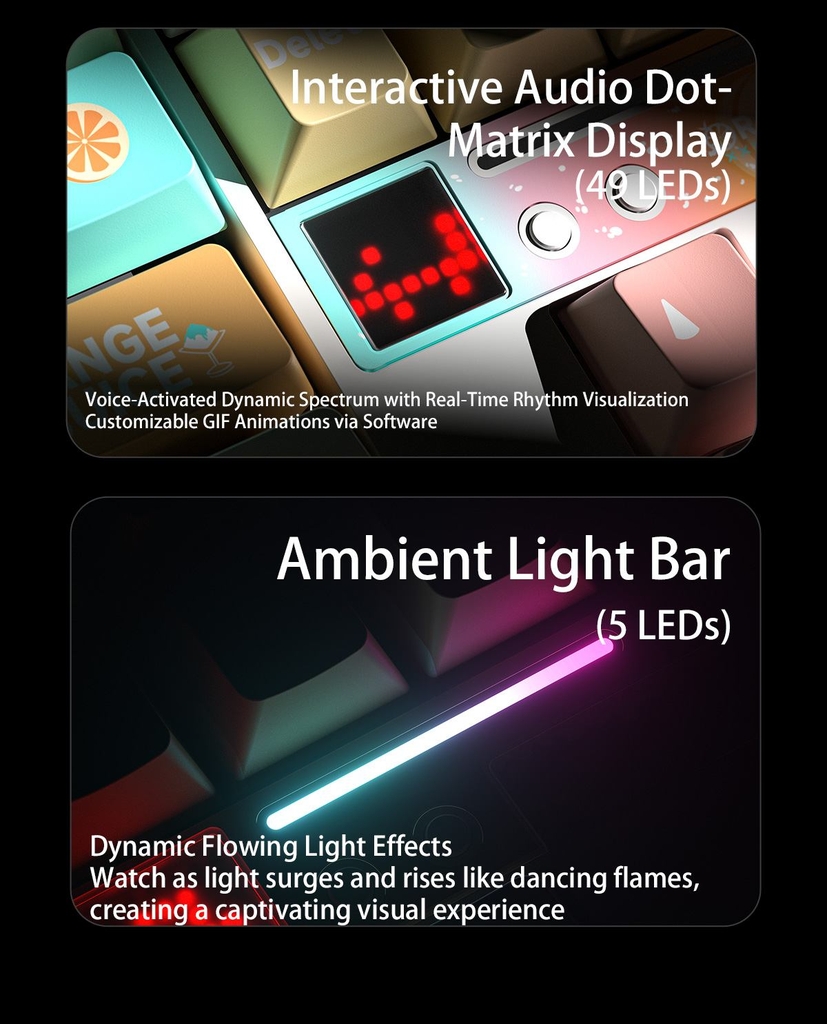 Hỗ trợ tùy chỉnh hiệu ứng DIY, trình chiếu GIF animation, đồng bộ theo giọng nói và hiệu ứng bắt nhịp âm thanh – biến bàn phím của bạn thành một hệ thống light show cá nhân hóa đầy ấn tượng.