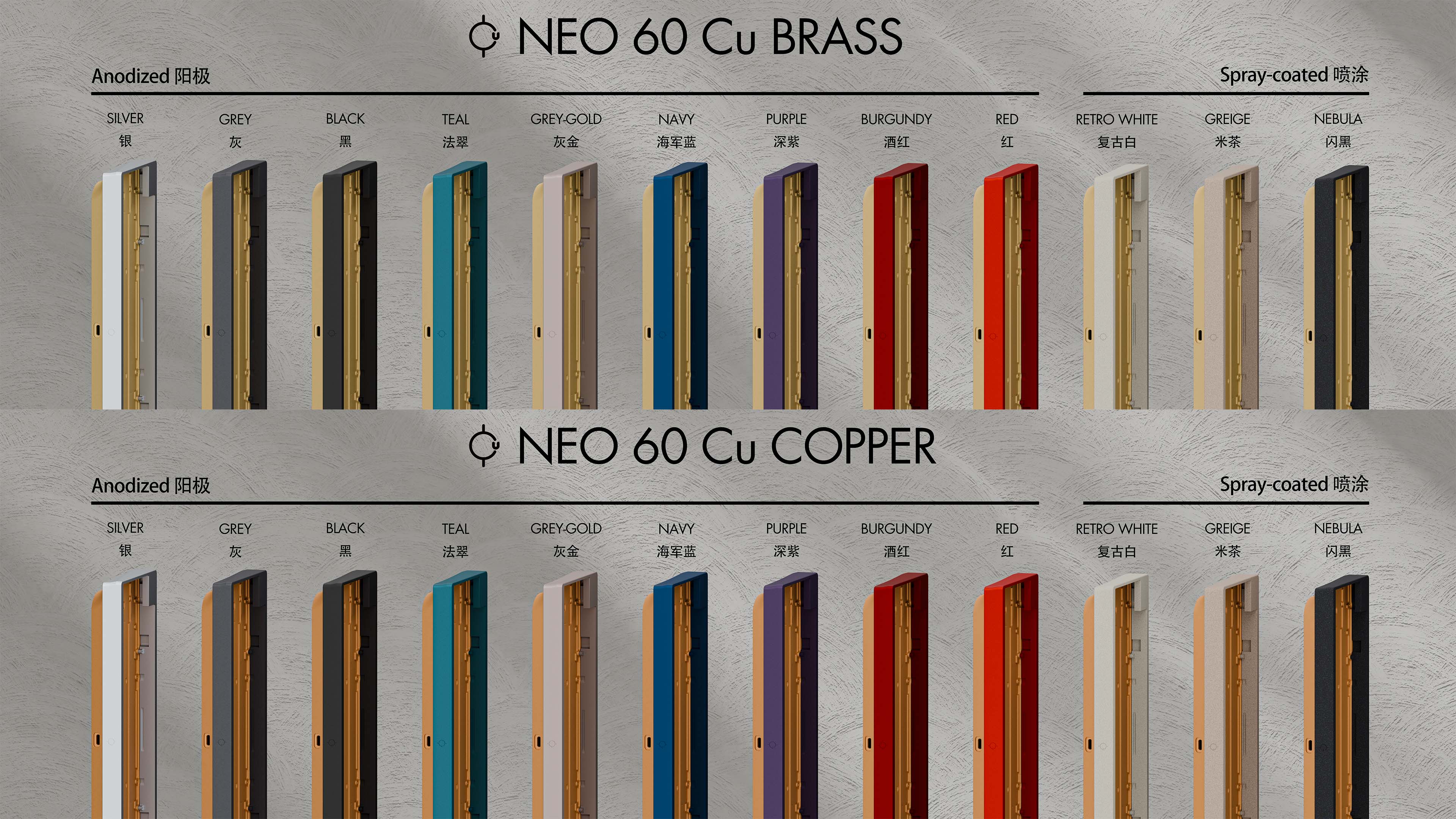 - Neo60 Cu nổi bật với viền cạnh siêu mỏng, đáy case làm hoàn toàn bằng đồng thau/đồng đỏ và thiết kế cong thanh lịch.