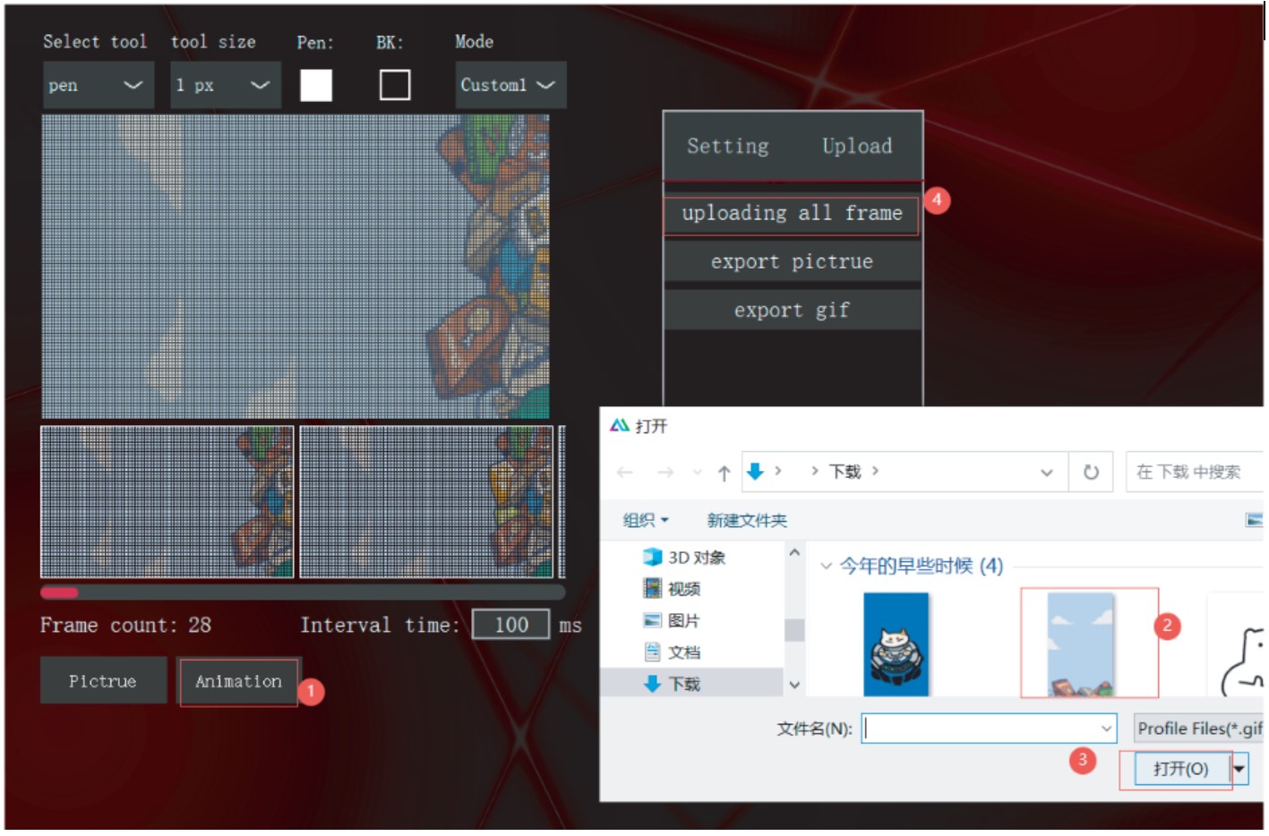 - Bước 2 : Mở Ứng dụng Công cụ Tùy chỉnh Hình ảnh và nhấp vào Ảnh hoặc Hoạt ảnh, chọn nó và mở, sau đó nhấp vào tải lên tất cả khung. Xem bên dưới :