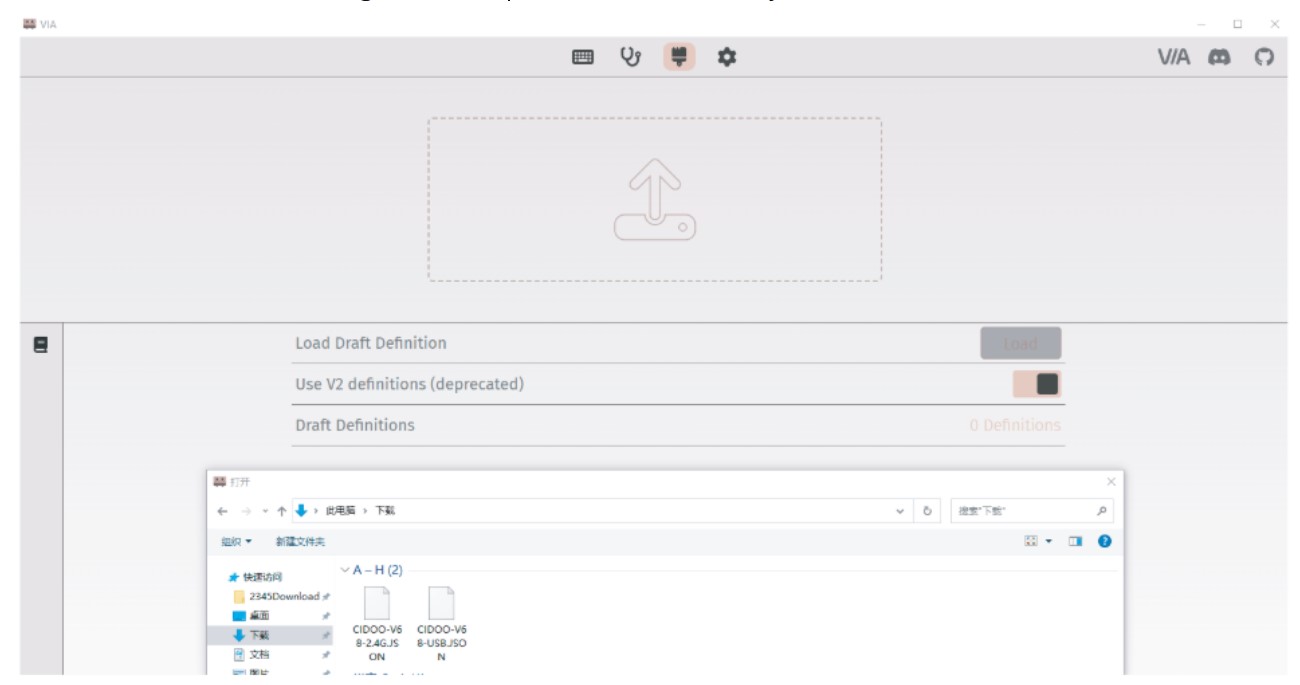 - Bước 2: Tải xuống CIDOO V68-2.4G.JSON và CIDOO V68-USB.JSON file thông qua nhà phân phối và tải file. (2.4G nếu ở chế độ 2.4g hoặc USB nếu ở chế độ có dây)