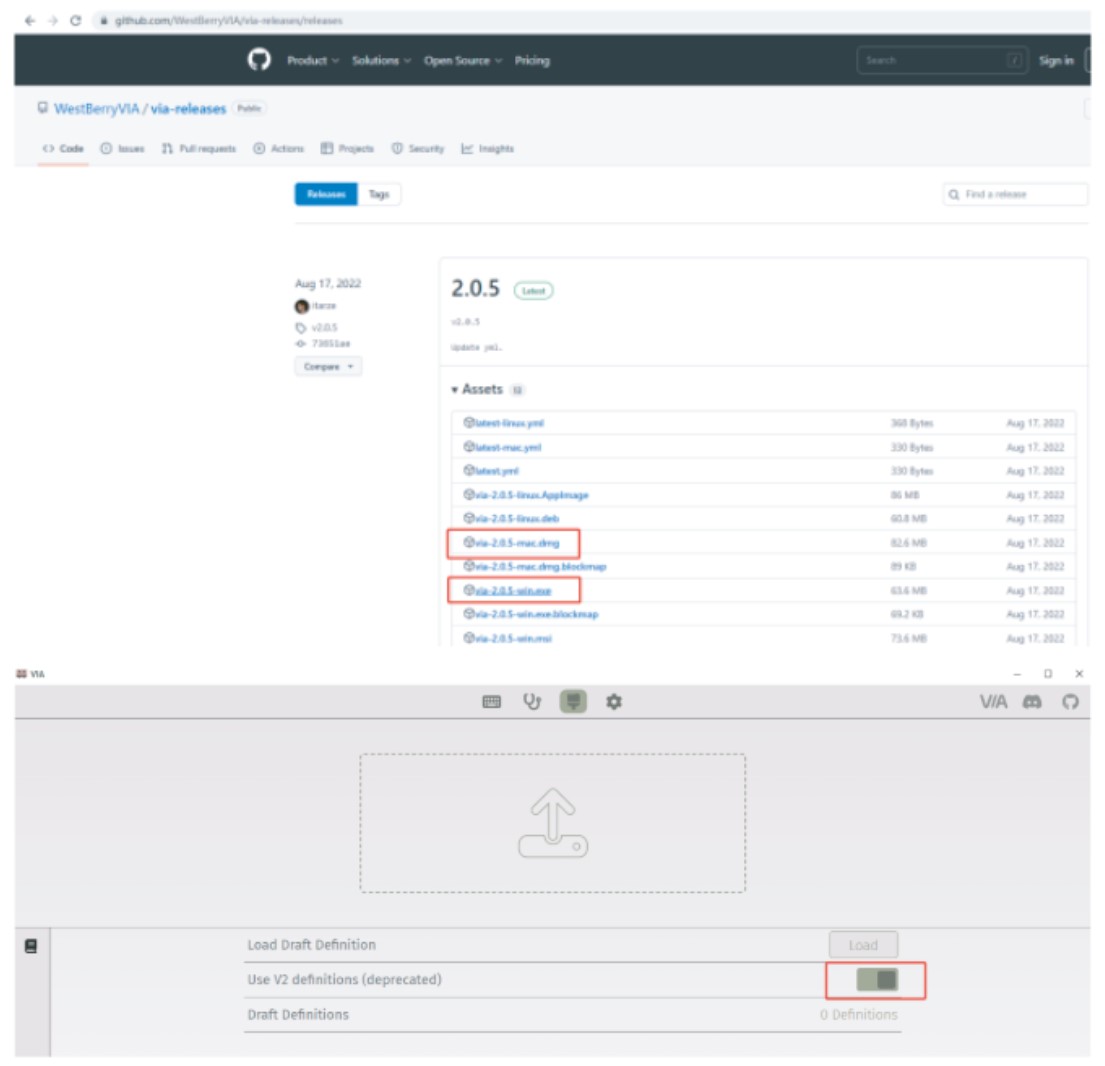 - Bước 1: Xin vui lòng truy cập https://github.com/WestBerryVIA/via-releases/releases để tải ứng dụng VIA mới nhất cho hệ điều hành máy tính tại đây. Mở phần mềm VIA và vui lòng nhấp vào Sử dụng định nghĩa V2 (không dùng nữa). Như ảnh sau Như ảnh sau hiển thị: