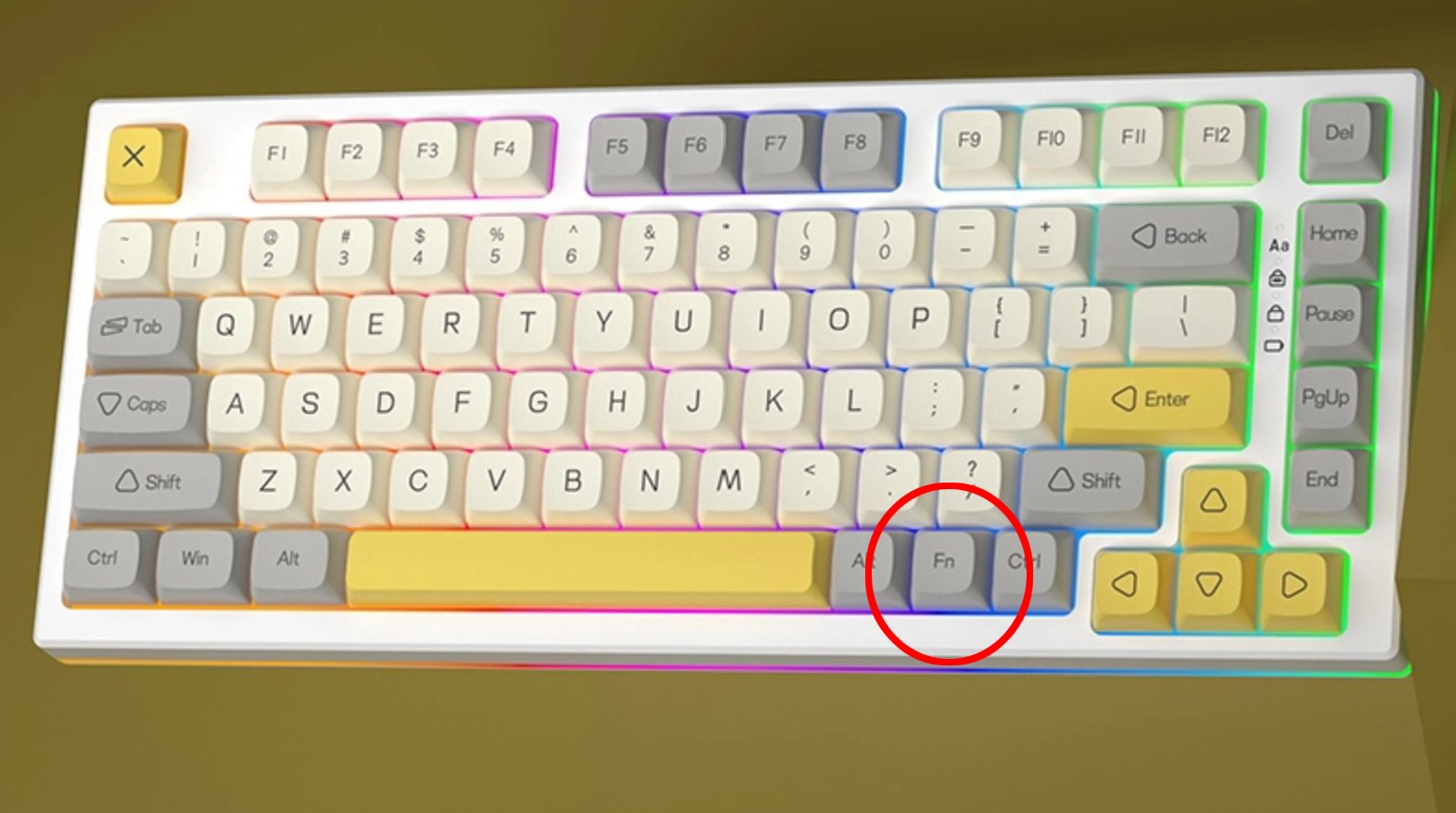 Nút FN mặc định của phím nằm tại vị trí này. Nút FN sẽ không có chức năng riêng lẻ mà sẽ phải kết hợp với một nút khác. Nút này bấm sẽ không thể hiện trên các trình test keyboard