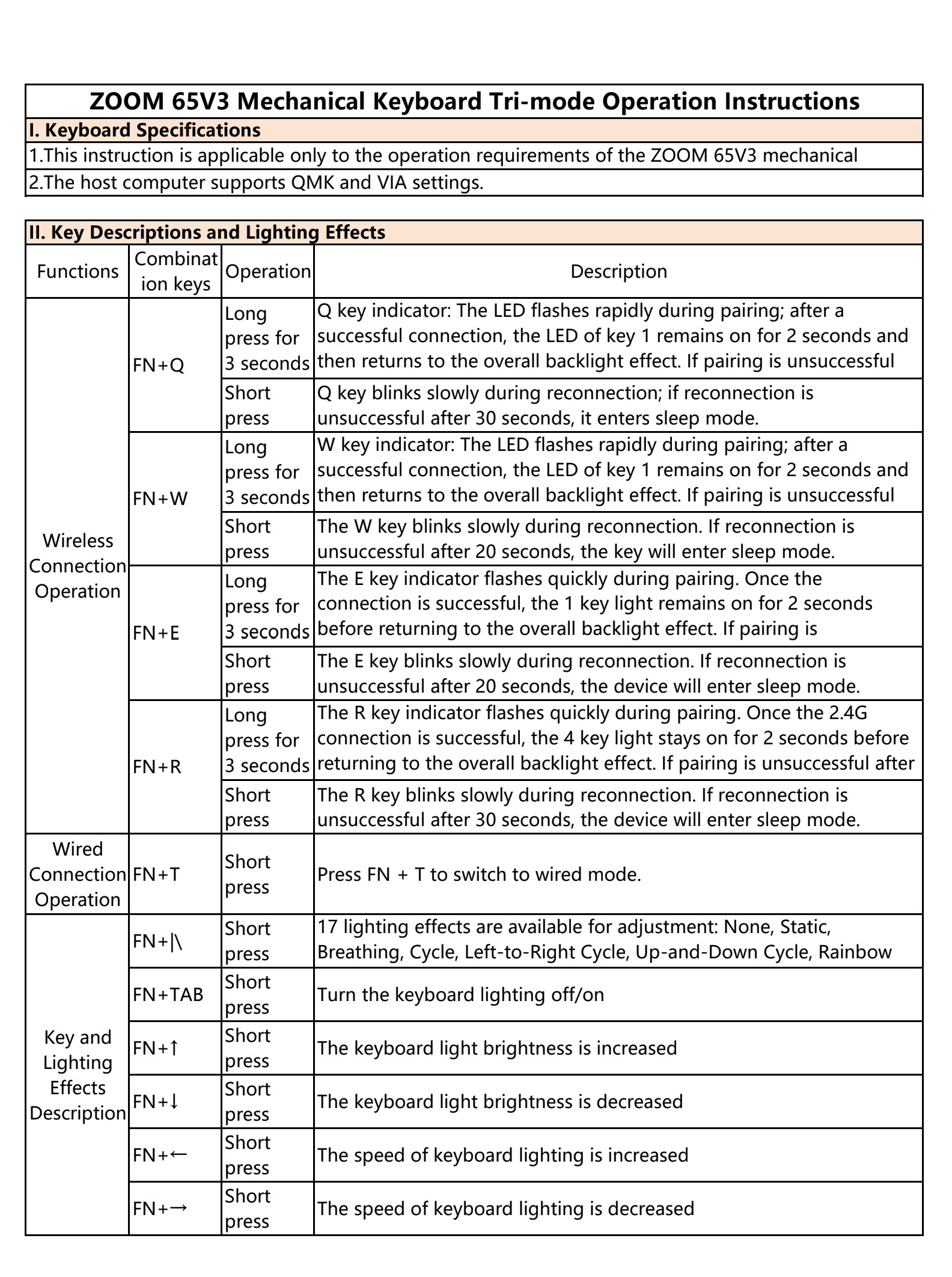 | Kết nối không dây | Fn + Q | Nhấn giữ 3 giây | Đèn phím Q nhấp nháy nhanh khi vào chế độ ghép nối. Sau khi kết nối thành công, đèn phím hiển thị sáng trong 2 giây rồi trở về hiệu ứng LED tổng thể. Nếu ghép nối thất bại, thiết bị sẽ không kết nối. |