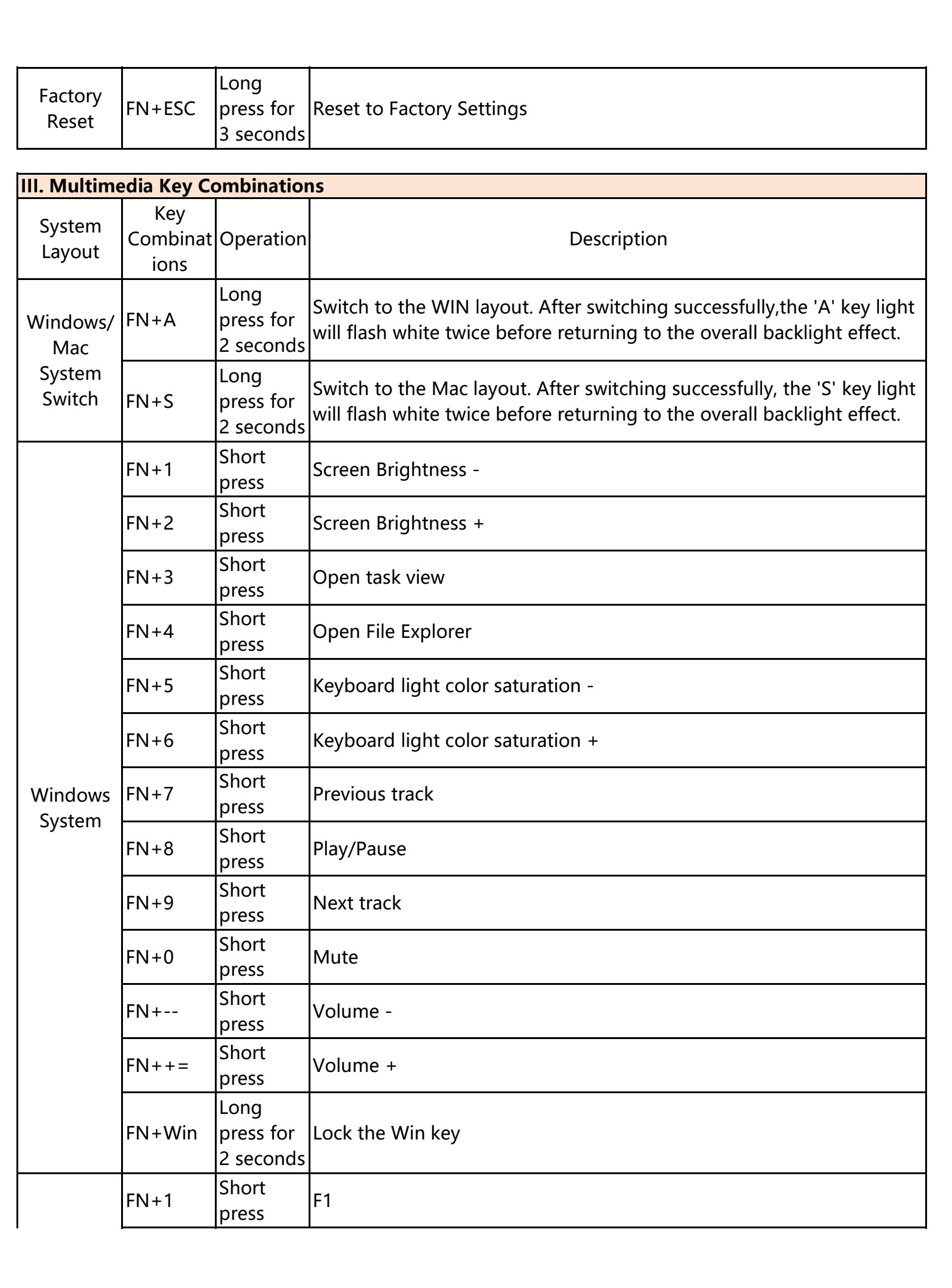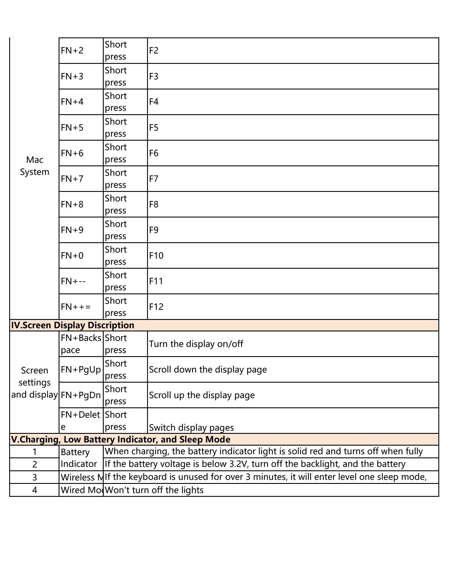 | Kết nối không dây | Fn + Q | Nhấn ngắn | Đèn phím Q nhấp nháy chậm khi đang tự động kết nối lại. Nếu không kết nối được sau 30 giây, bàn phím sẽ chuyển sang chế độ ngủ. |