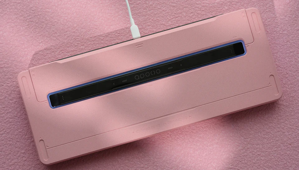 Tạ & badge: chuyển sang thép không gỉ PVD bóng gương. Phía sau bàn phím được bổ sung thêm một thanh thép PVD phun cát trang trí – tạo điểm nhấn sang trọng nhưng tinh tế.