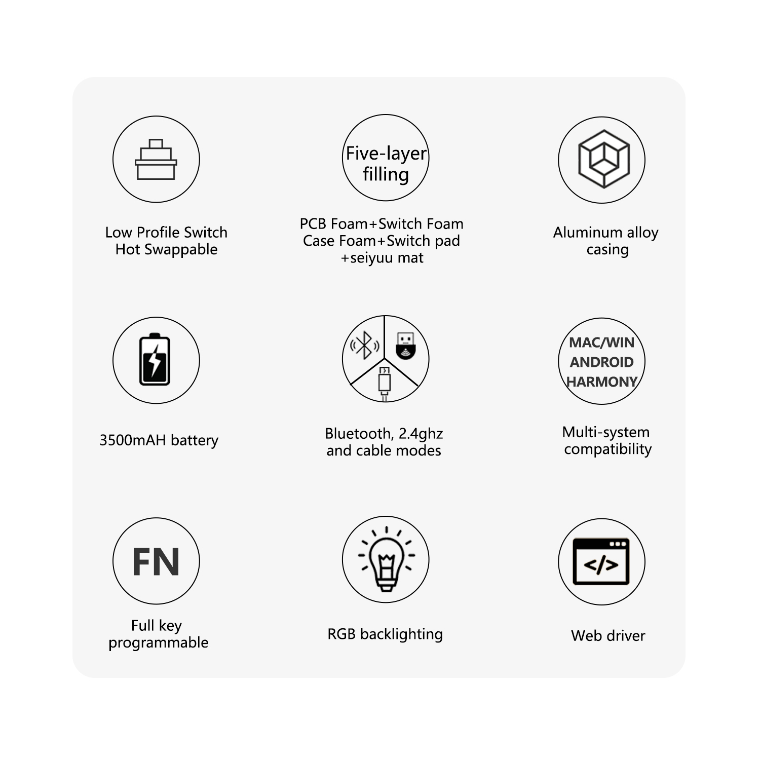 - PCB mặc định, 3 mode kết nối Bluetooth/2.4G/Có dây