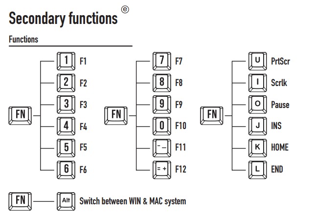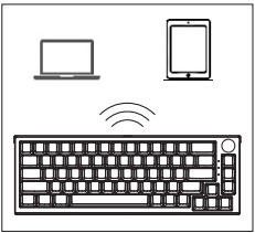 Chế độ BT: Maxfit67 có thể kết nối tối đa 3 thiết bị Bluetooth đồng thời thông qua phím kết hợp, kết nối bluetooth bằng cách giữ FN + Q / FN + W / FN + E. Sau đó, điều hướng vào cài đặt BT thiết bị của bạn và bắt đầu ghép nối Trong quá trình ghép nối, chỉ báo sẽ tiếp tục nhấp nháy. Sau khi kết nối, đèn báo sẽ luôn sáng. Đèn báo: FN + Q = Đỏ FN + W = Xanh lam FN + E = Vàng |