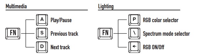 | Fn + A | Play/Pause | Fn + P | Chuyển màu led |