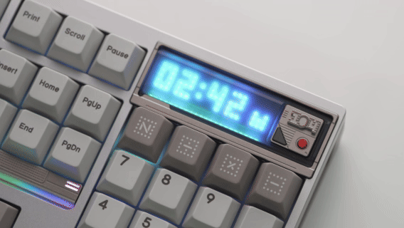 Mọi thông tin — thời gian, mức pin, chế độ Windows/Mac và trạng thái Caps Lock — đều được hiển thị rõ ràng trên màn hình pixel.